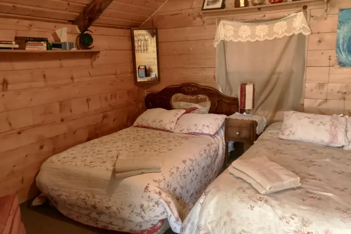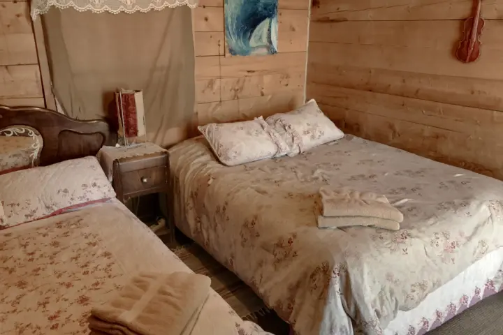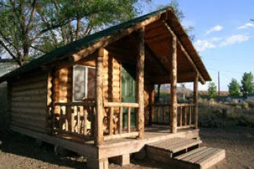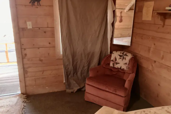 The only “modern” cabin on our campsite, Old Pine Cabin is a beautiful log cabin located near our grassy camping lawns. Old Pine Cabin features a queen and a double bed. It also includes electricity, an electric heater, covered front porch, outdoor fire pit with a picnic table, and furnishings. There is no running water, but the cabin is located only a few hundred feet away from the common bathhouse, which has toilets, sinks, and hot showers. Take a walk outside for the bathroom, just like the pioneers did!